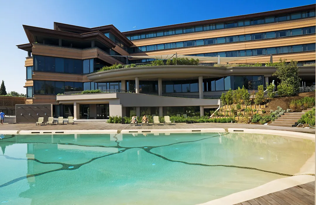 Rooms at A.Roma Lifestyle Hotel include 276 spacious units designed with contemporary aesthetics and functionality, many featuring large windows and balconies overlooking the surrounding greenery. Options include Deluxe Rooms, Premier Rooms with Valle dei Casali views, and Family Suites which are ideal for accommodating families, as well as Junior and Presidential Suites with generous space and high-end amenities.