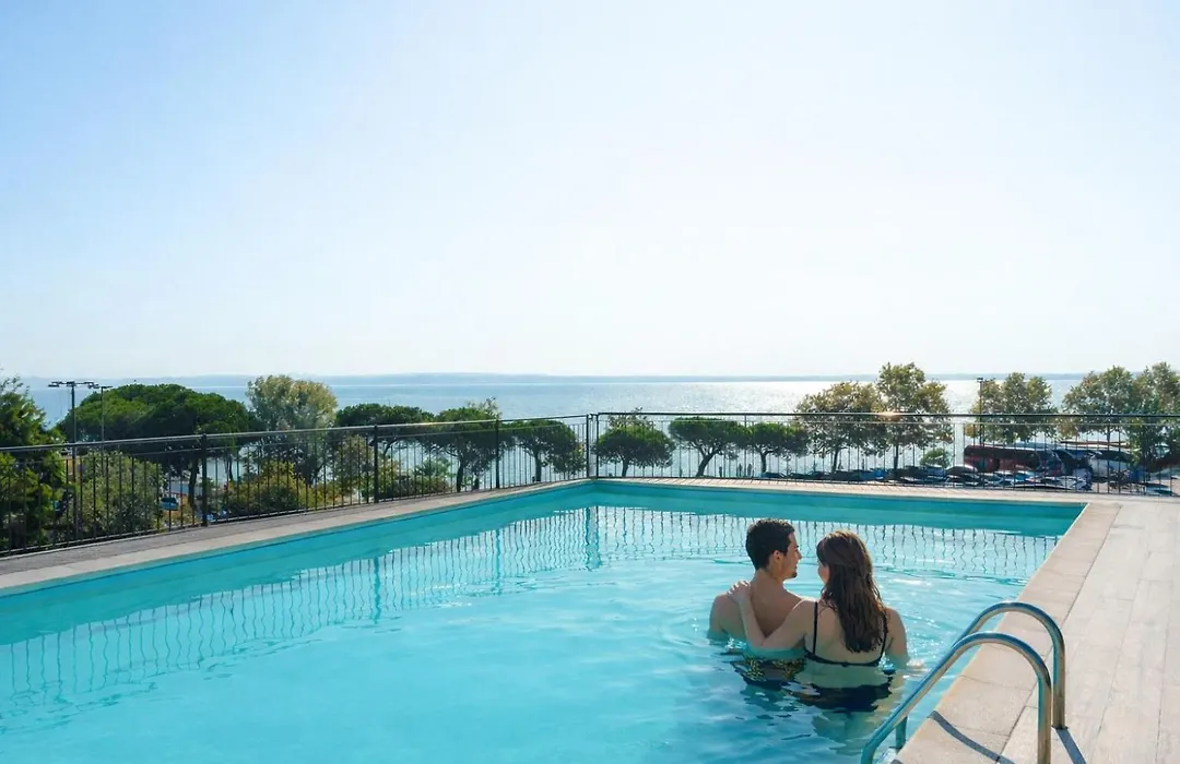 Alevic Hotel Sirmione is a 4-star hotel featuring air-conditioned rooms with private balconies and scenic lake views. It offers a rooftop pool with a solarium and a bar, along with meeting facilities. The historic center, including Scaliger Castle and the Grotte di Catullo, is within walking distance.