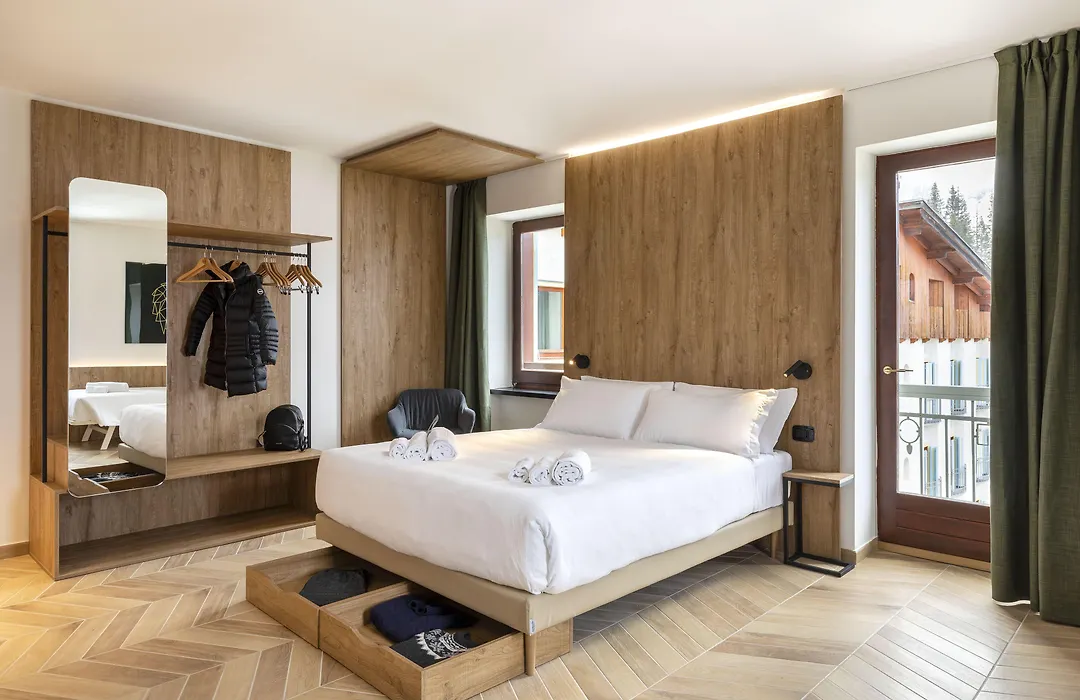 Rooms at B&B Hotel Passo Tre Croci Cortina are designed with modern decor and include amenities such as a safe, mini fridge, and en-suite bathrooms with rainfall showerheads. Various room types are available, accommodating singles, families, and those with disabilities.
