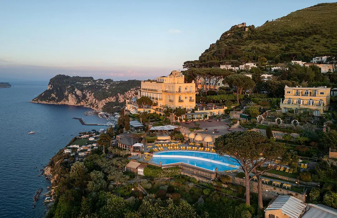 Hotel Caesar Augustus, a 5-star hotel rated 9.5/10 on Booking.com, offers spectacular views from its cliff-edge location in Anacapri. This boutique hotel features 56 uniquely decorated rooms, an infinity pool, and an on-site wellness center.