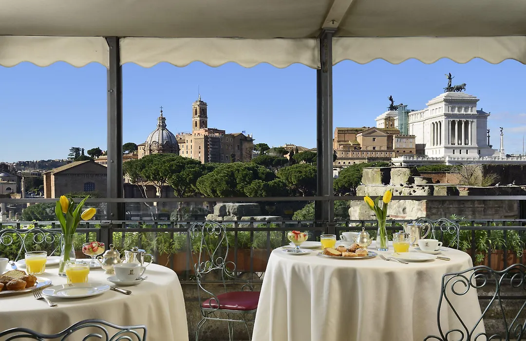 Dining options include the Ristorante Roof Garden, which overlooks the Roman Forum, and the American Bar on the terrace serving a variety of drinks. Breakfast is served daily, offering a selection of sweet and savory foods with stunning views.