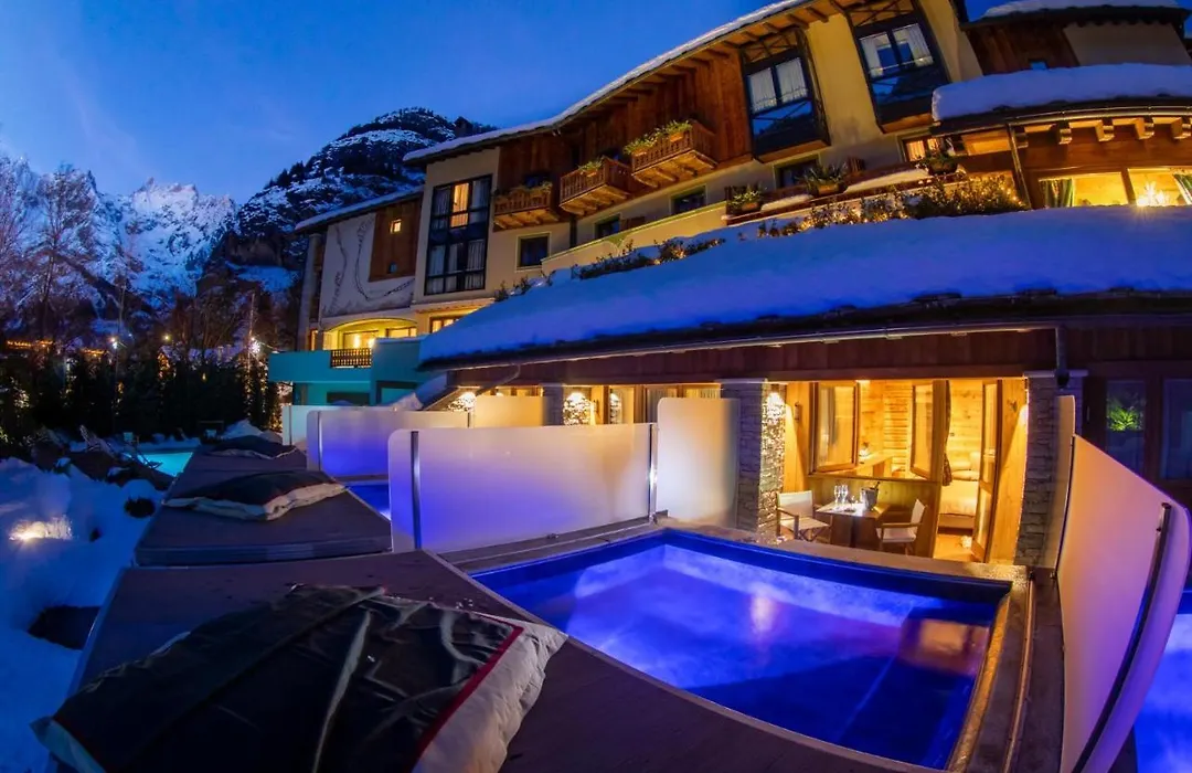Gran Baita Hotel & Wellness offers 51 elegantly furnished rooms with amenities such as premium bedding, minibars, and free WiFi. Most accommodations feature a balcony or terrace, some with views of the Mont Blanc massif. Guests can choose from rooms equipped with a private outdoor mini-hydromassage pool or scenic sauna.