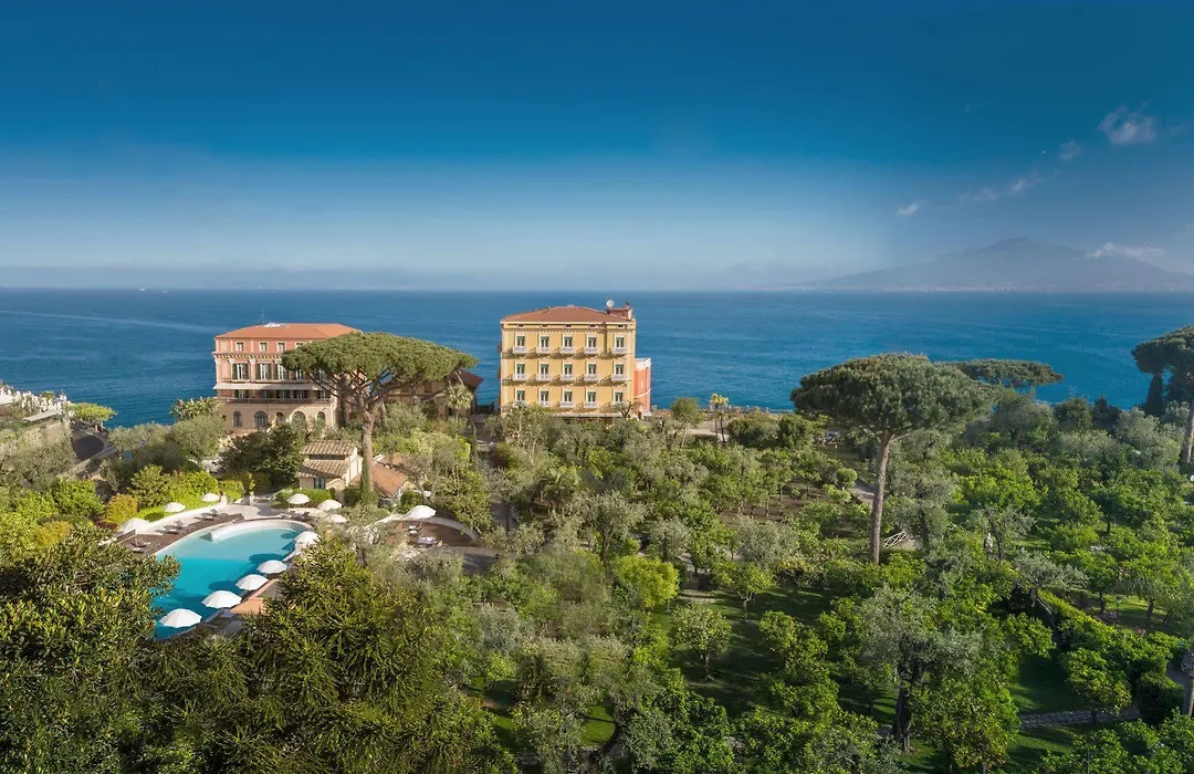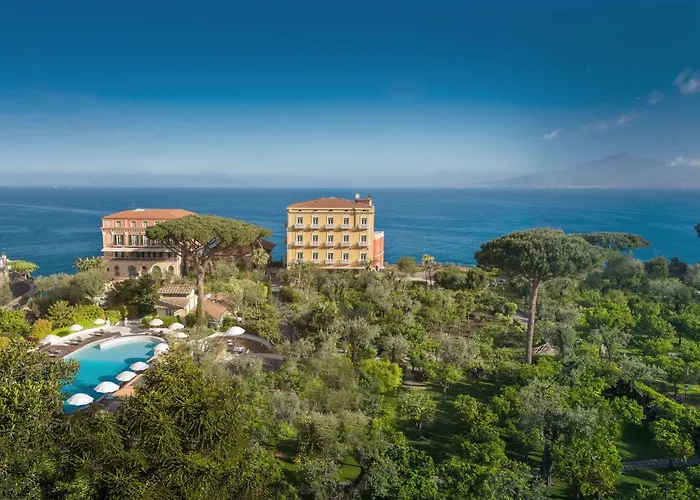 Grand Hotel Excelsior Vittoria, a 5-star luxury hotel with a 9.8/10 rating on Booking.com, features exceptional dining, a Boutique Spa La Serra, and beautiful outdoor spaces, including a playground. The property is set on a cliff overlooking the Gulf of Naples and boasts lush gardens spanning 2 hectares.