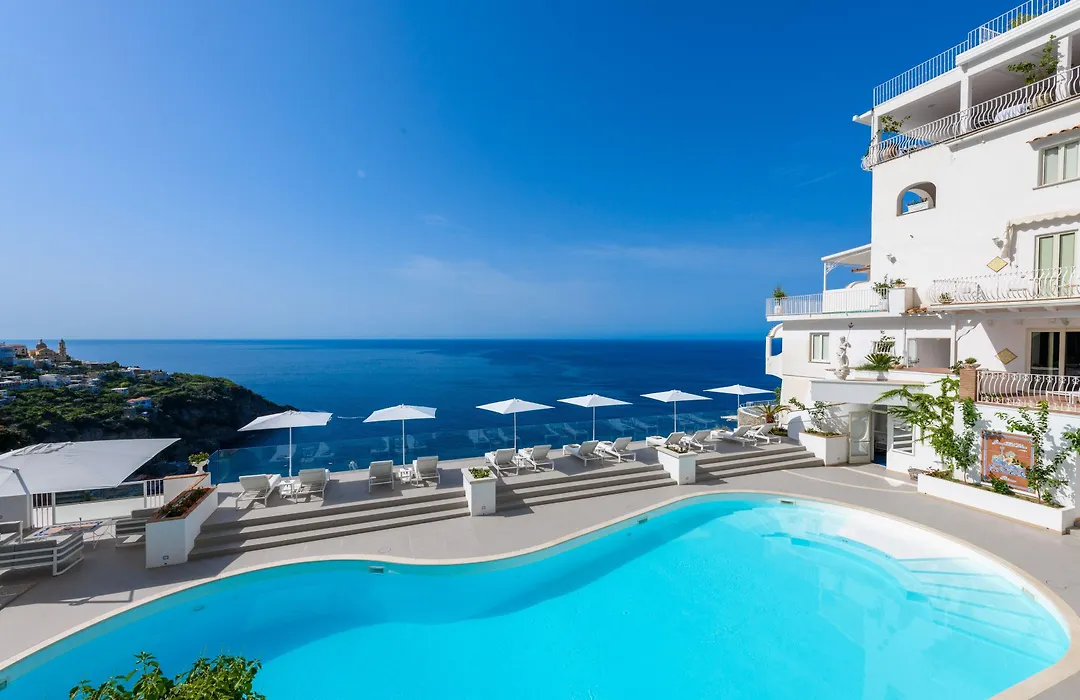 Grand Hotel Tritone, a 5-star Praiano hotel rated 9.7/10 on Booking.com, features a private beach with a saltwater pool and panoramic sea views. The hotel is known for its authentic Mediterranean cuisine and stunning clifftop location.