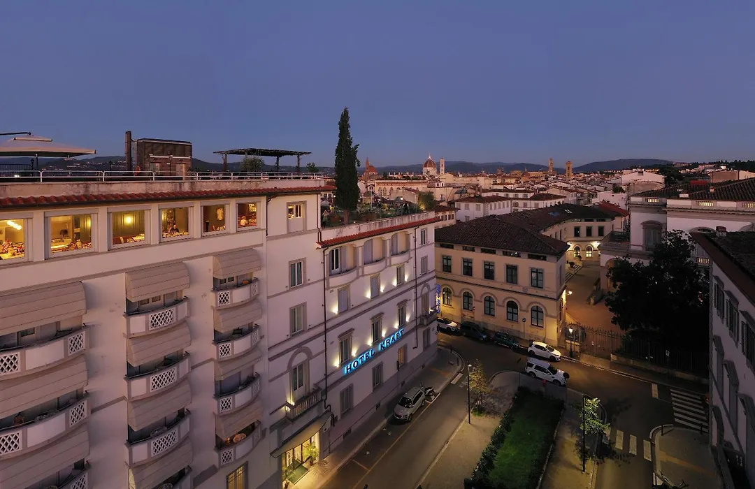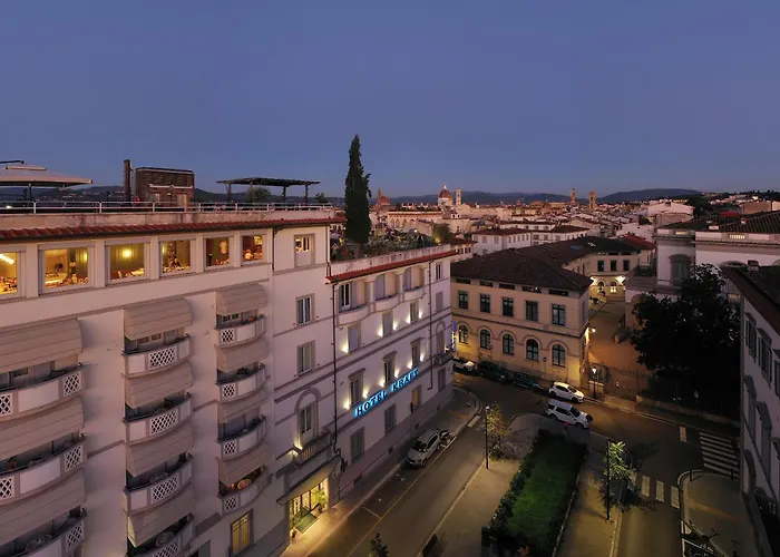 Hotel Kraft, a 4-star Florence hotel rated 9.0/10 on Booking.com, features a panoramic rooftop terrace with a heated pool and restaurant offering views of the Brunelleschi Dome. The hotel provides well-appointed accommodations, a fitness center, and a bar for light meals throughout the year.