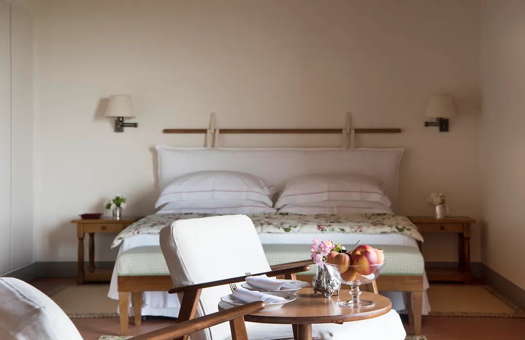 Rooms feature beamed ceilings and terracotta floors. Choices include spacious junior suites with private terraces, some overlooking the vineyards or equipped with extra amenities like garden areas and four-poster beds.