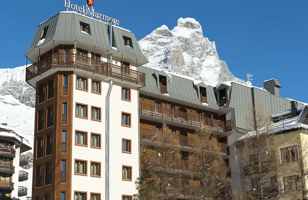 Hotel Marmore, a 3-star Breuil-Cervinia hotel with a 9.0/10 rating on Booking.com, features ski-in/ski-out access and accommodations ideal for families and conference groups. The hotel showcases rustic Aosta-style architecture and offers a restaurant serving locally produced Italian cuisine.