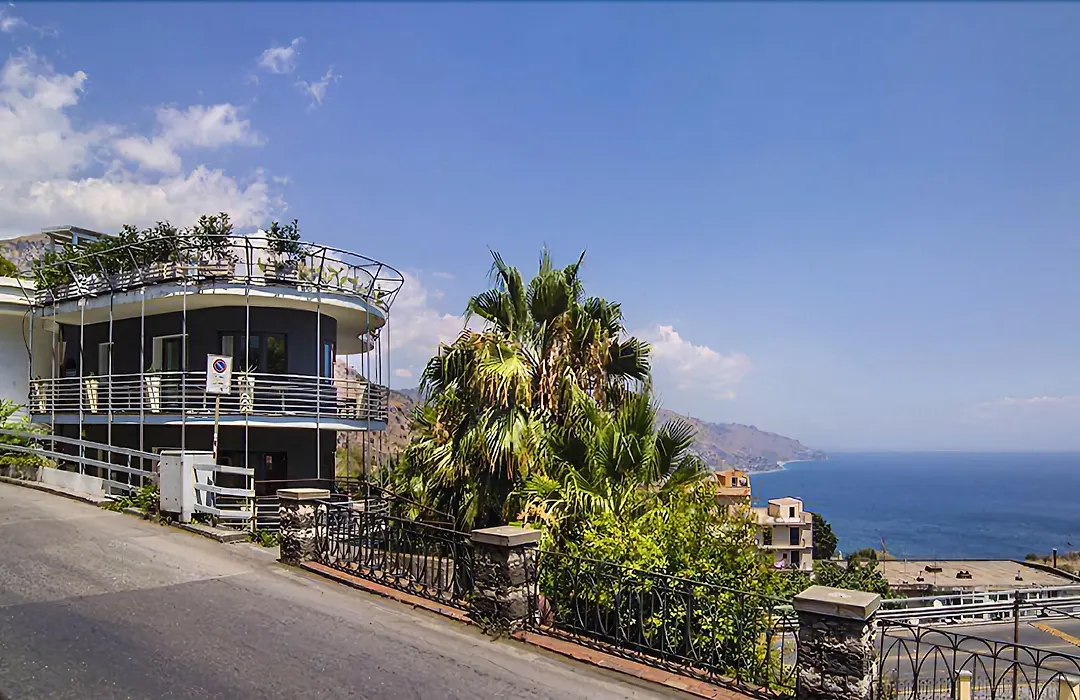 Taormina Palace Hotel, rated 7.9/10, is a 4-star hotel known for its prime location near the historic center and the cable car to the beaches. Amenities include a wellness center with a sauna, Turkish bath, hot tub, and a panoramic terrace overlooking the Ionian Sea.
