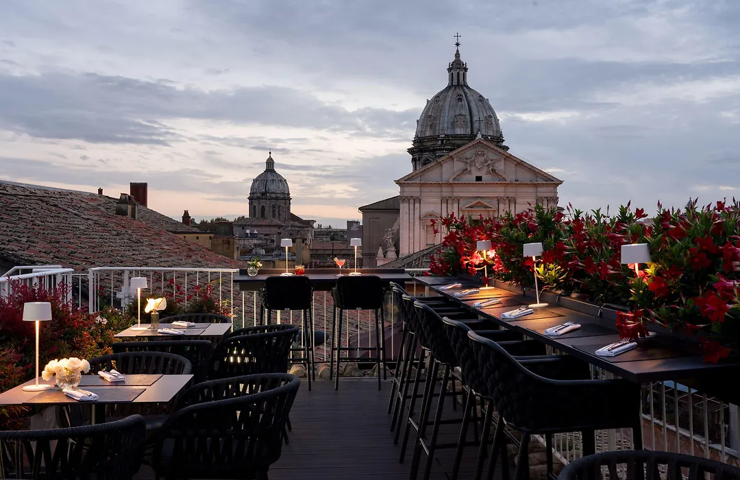 Dining options include a rich breakfast buffet with a selection of gourmet items, and room service offers a light menu featuring pasta, meats, and salads. The rooftop terrace, Terrazza Navona, serves cocktails in the evening, providing a unique spot to relax.