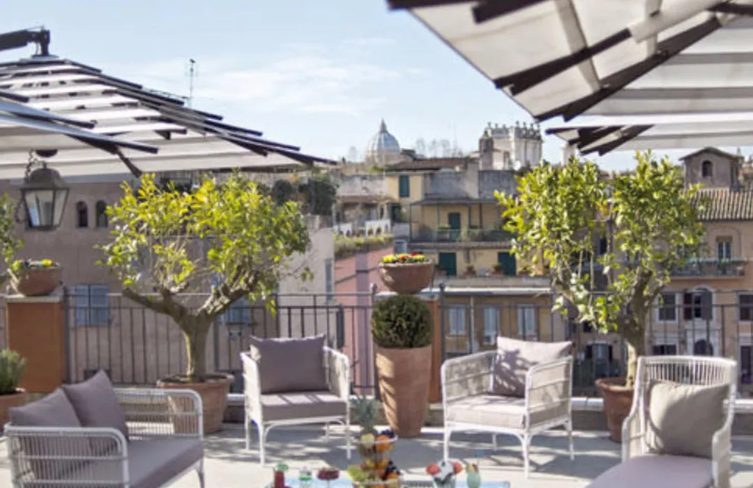 Rooms at Hotel Ponte Sisto feature a blend of classical and modern design, including marble bathrooms with exclusive toiletries by Trussardi. Choices range from Deluxe rooms with panoramic views to suites with private terraces and Jacuzzis, ensuring ample comfort for different needs.