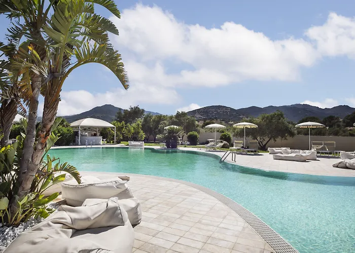 The swimming pool at Hotel San Teodoro is surrounded by lush Mediterranean vegetation, providing a serene setting for relaxation. Guests can enjoy direct access to La Cinta beach, known for its crystal clear waters, and participate in various marine sports like windsurfing and sailing.