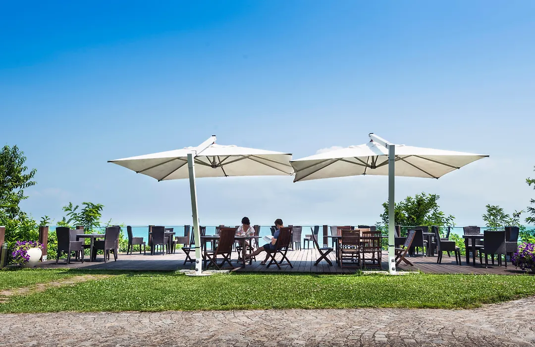 Dining options include two sea-view restaurants offering varied menus focusing on local cuisine. Special provisions for dietary needs and children's meals are available, and a lunchtime buffet is offered specifically for returning cyclists.