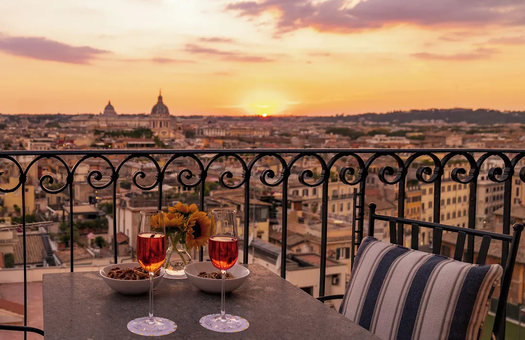 Located near the famous dining options on Via Veneto and Via Condotti, the hotel provides guests with easy access to renowned restaurants and bars serving traditional Italian cuisine. Breakfast is served on the terrace, enhancing the dining experience with a view of the Roman skyline.
