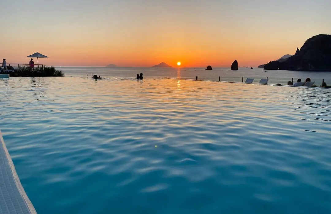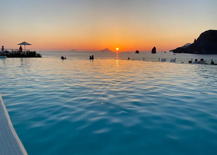 Therasia Resort Sea And Spa - The Leading Hotels Of The World offers an exclusive luxury retreat with five-star accommodation set in the scenic Aeolian Islands. The resort features multiple dining options, wellness facilities, and two small seawater pools for relaxation. Guests enjoy breathtaking views of the Mediterranean Sea, including Lipari and Stromboli.
