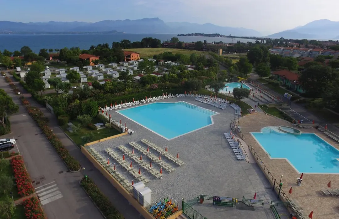 The Garda Village features three swimming pools, including a children's pool with slides and whirlpool areas. Sports facilities encompass a football pitch, beach volleyball court, tennis courts, and mini-golf.