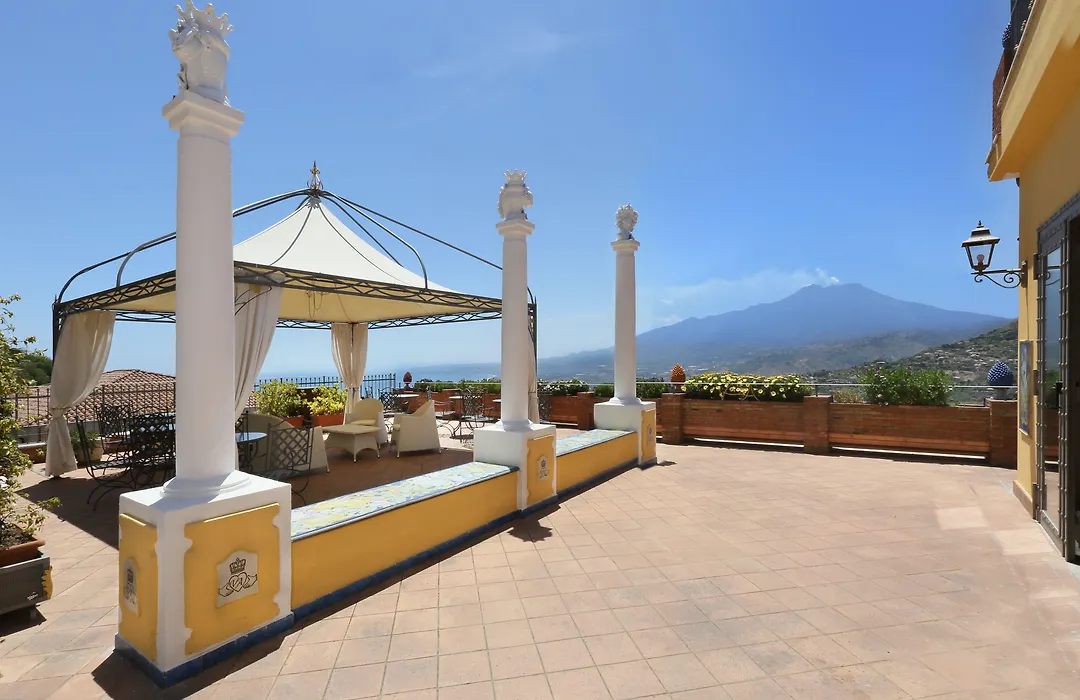 Villa Angela, a 4-star boutique hotel rated 9.4/10 on Booking.com, offers a stunning location above Taormina town with breathtaking views of Mount Etna and the Ionian Sea. This family-run establishment features 27 rooms, an outdoor swimming pool, and a rooftop bar terrace.